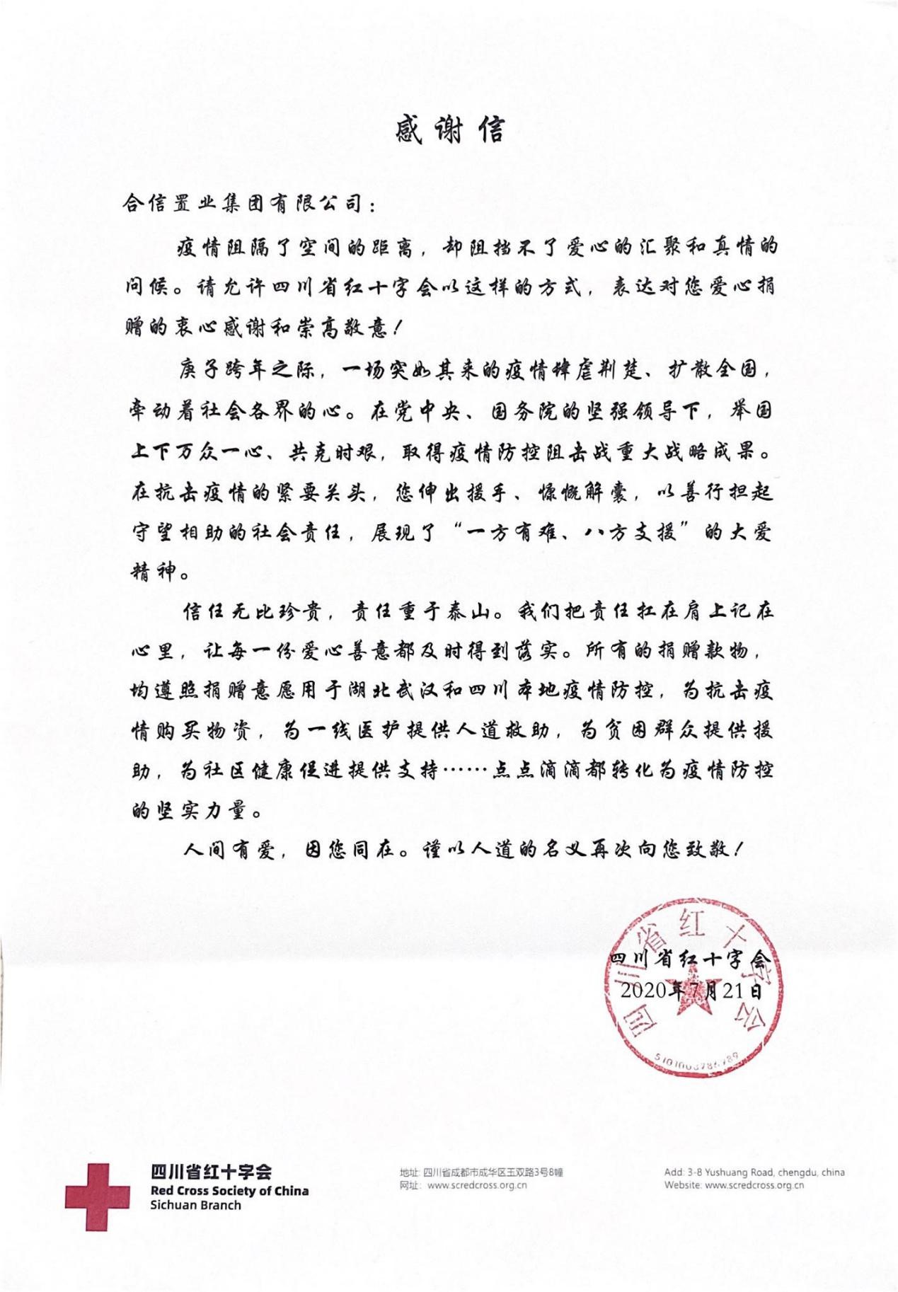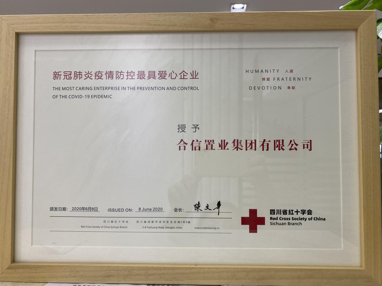 凭借在新冠肺炎抗疫工作的积极担当与无私奉献,合信置业集团荣获由四川红十字会颁布的“新冠肺炎疫情防控最具爱心企业”荣誉证书及感谢信。