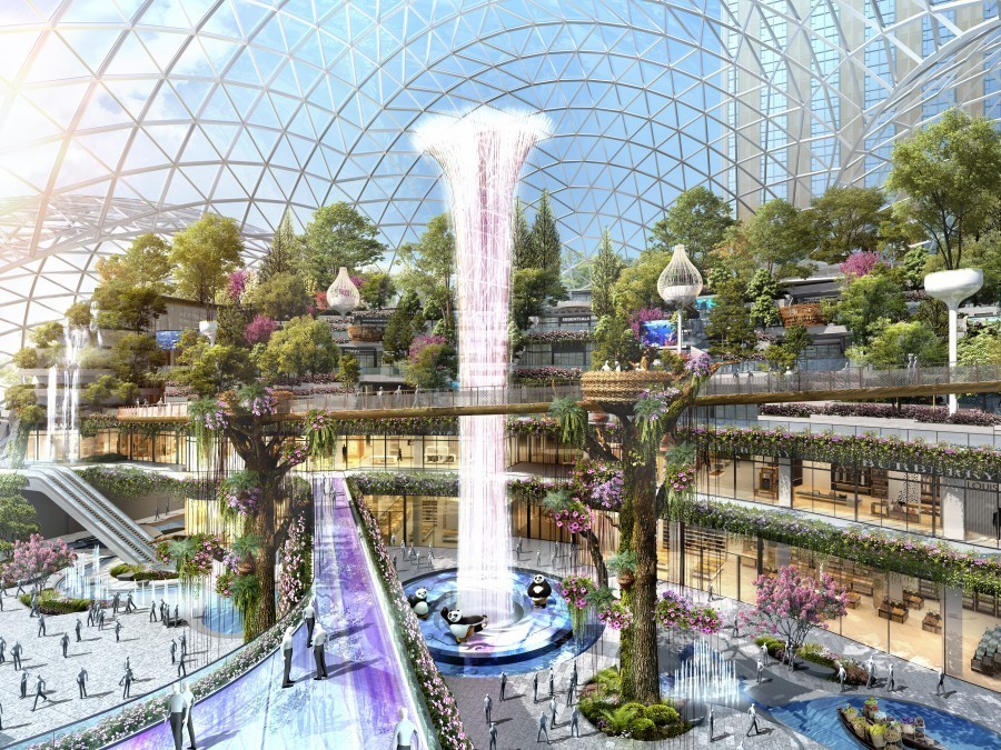 K101 PANDA PARK热带雨林购物公园,大熊猫状巨型玻璃建筑。以热带雨林、瀑布、森林、花卉、河流构建沉浸式公园购物奇趣新场景。
