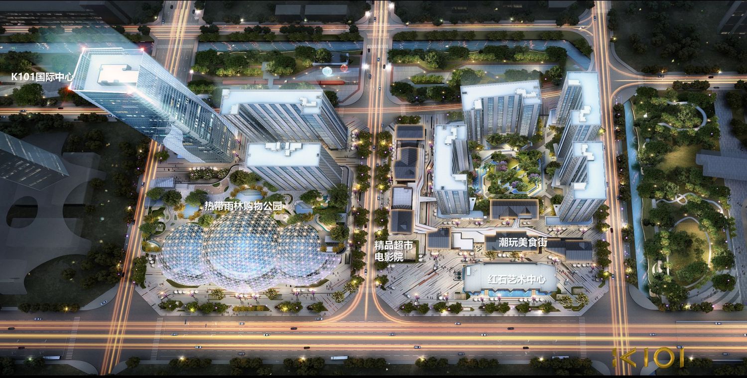 集K101 PANDA PARK热带雨林购物公园、奢华精品酒店、甲级写字楼、红石艺术中心、潮玩美食街、公园精奢LOFT于一体的公园城市商业综合体,